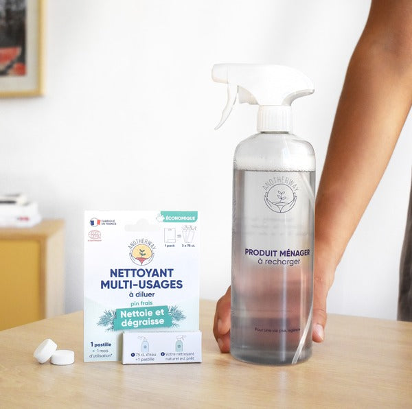 Prêts à passer à un ménage 100% écologique ? Notre nettoyant multi-usages est un produit ménager sous forme de pastille à dissoudre dans l'eau. Sans emballage plastique et avec 90% d'impact carbone en moins. Vive notre jolie planète !