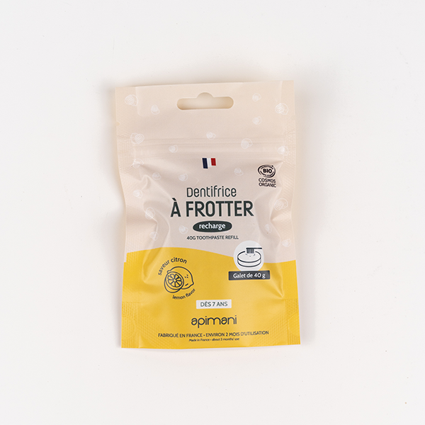 Un petit zeste pour votre quotidien, un grand zeste pour la planète ! Cette pâte solide de 40 g au goût citronné prend soin de vos dents pendant environ 2 mois, avec deux brossages par jour. Chez Apimani, nous privilégions des ingrédients sains et 100 % naturels, vous offrant ainsi une solution écologique pour réduire les déchets plastiques dans votre salle de bain. Optez pour des solutions pratiques et responsables avec nos galets de dentifrice rechargeables !
