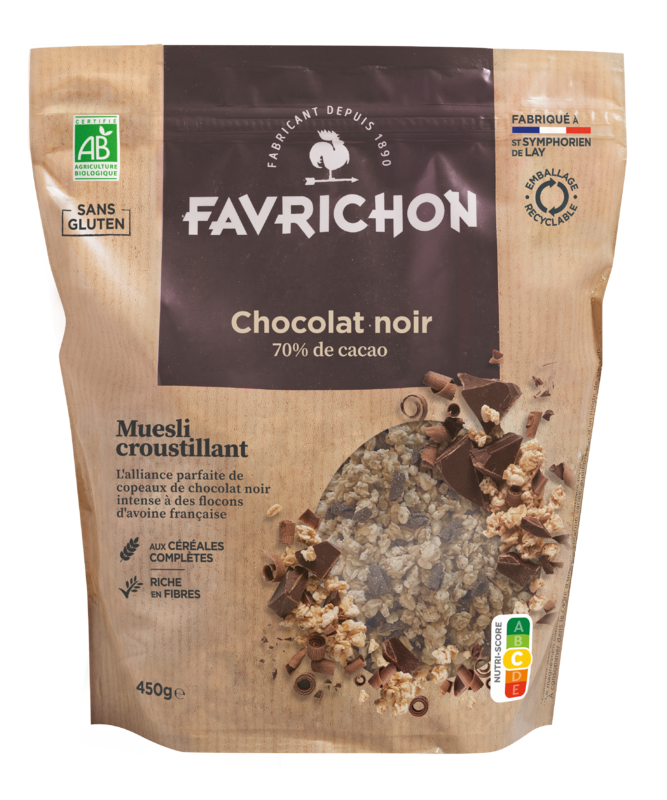 L’association incontournable entre un Muesli Croustillant Nature et des copeaux de chocolat noir intense (à 70% de cacao).