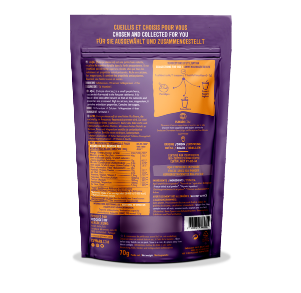 Cette petite baie violette originaire d'Amazonie est utilisée depuis des millénaires par les tribus indigènes d'Amérique du Sud pour ses propriétés nutritionnelles et médicinales. Il contient une faible teneur en sucre et une teneur élevée en vitamine E, magnésium et potassium.