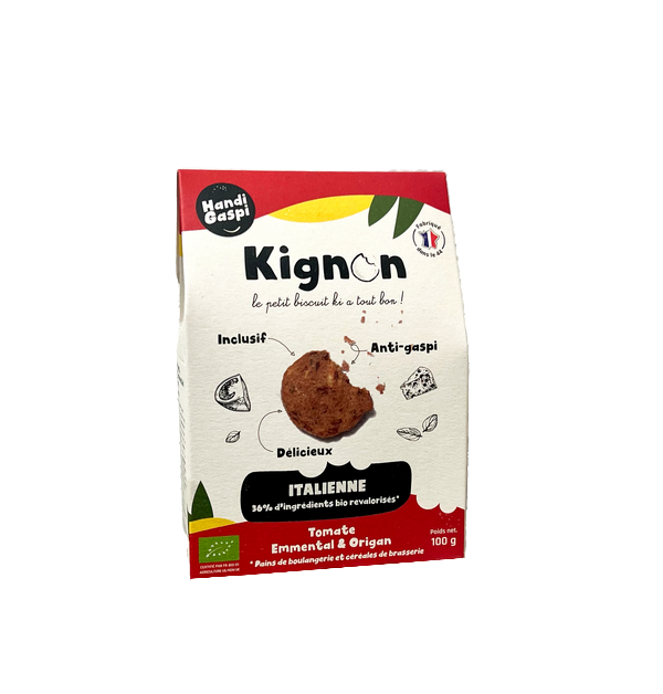 Des morceaux d'emmental, une touche de tomate et une note d'origan, le tout niché dans un biscuit salé bio façon pizza concocté avec amour à partir d'invendus de pain et de céréales de brasserie.