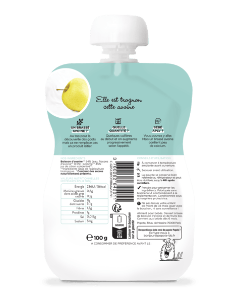Boisson d'avoine* 54% (eau, flocons d'avoine* 8,5%), pomme* 45%, jus de citron concentré*. *Issus de l'agriculture biologique.