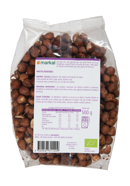 Noisettes biologiques. Peut contenir des fragments de coques.