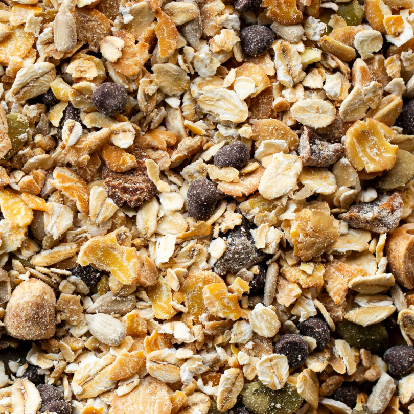Avoine*, flocons de soja*, pépites de chocolat noir 60%°*, cacahuètes grillées*, graines de courge*, graines de tournesol*, datte*.