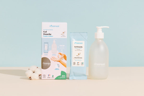Ce kit contient 1 bouteille 300ml + 1 recharge de gel douche en poudre à diluer. Une recharge en poudre de 25 g à diluer avec de l'eau du robinet permet de créer 250 ml de lavant à la Fleur de Coton.