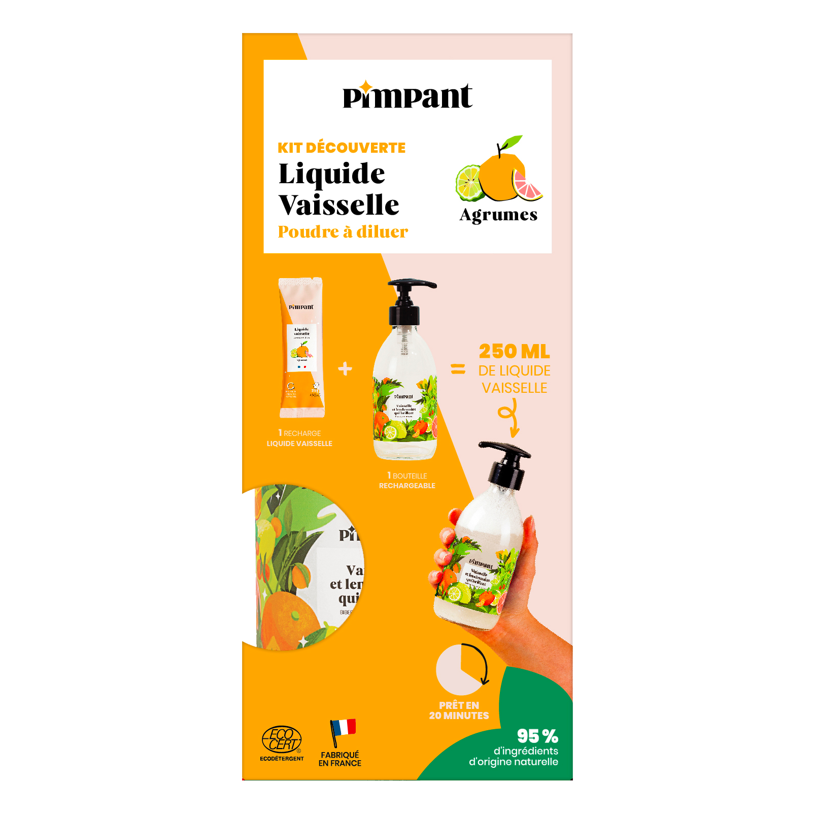 Ce kit contient: 1 bouteille rechargeable + 1 stick de liquide vaisselle en poudre à diluer = 250 mL de liquide vaisselle.